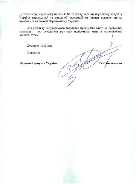 Ïåðøà òà îñòàííÿ ñòîð³íêè äåïóòàòñüêîãî çâåðíåííÿ Îìåëü÷åíêà