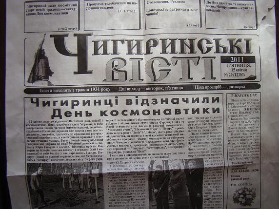 PS. Íîìåð ãàçåòû «×èãèðèíñüê³ â³ñò³» îò 15 àïðåëÿ 2011 ãîäà ¹29 ñ îãëóøèòåëüíûì ïî ñèëå âîçäåéñòâèÿ ìàòåðèàëîì «×èãèðèíö³ â³äçíà÷èëè Äåíü êîñìîíàâòèêè» íàâå÷íî ïðîïèñàí â íàøåì àðõèâå.