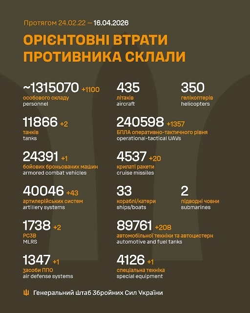 Загальні бойові втрати противника з 24.02.22 по 16.04.26 орієнтовно становлять: