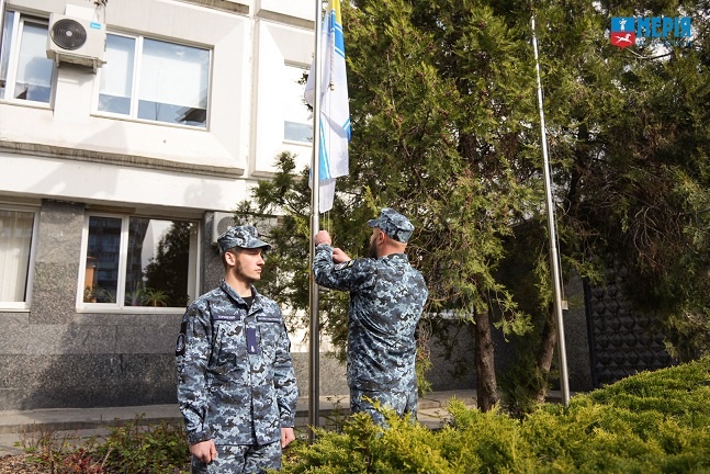 Право підняти прапор Військово-Морських Сил Збройних Сил України було надано старшині 1 статті, командиру групи артилерійських катерів Максиму Колеснику. Під звуки Державного Гімну України стяг урочисто підняли над містом.
