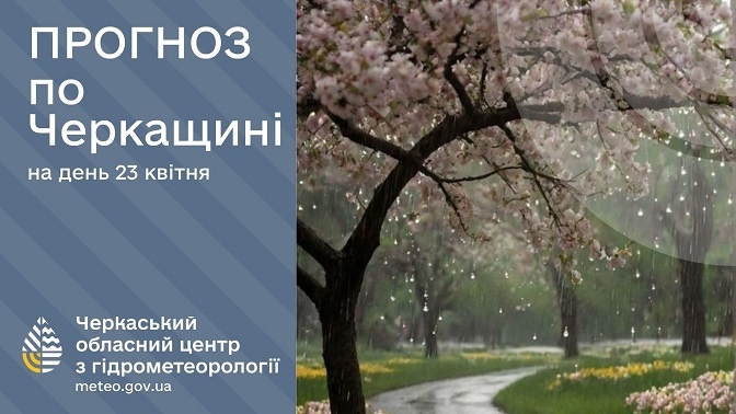 08:15 23.04 23 квітня в Черкаській області хмарно з проясненнями, дощ, 7-12º