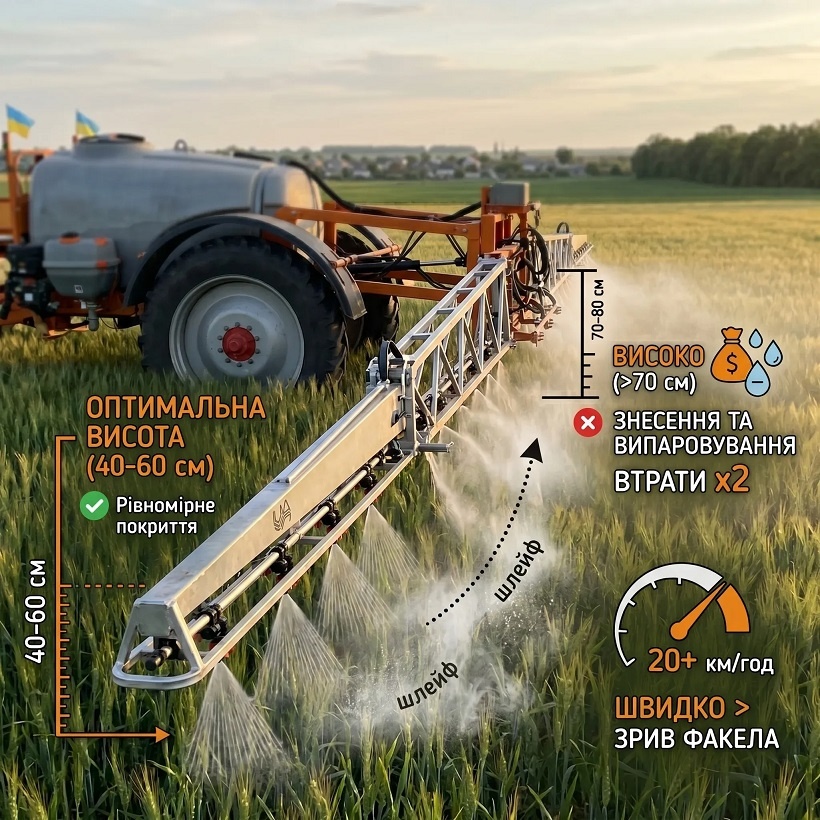 Кожні додаткові 10 см підйому над оптимальним рівнем подвоюють втрати від знесення та випаровування ЗЗР. Ще гостріше це видно, коли штанга гуляє через нерівний рельєф без стабілізації і локально підскакує до 70-80 см: розпилювачі в цій точці переходять у режим дрейфу навіть при повній відсутності вітру. Через це висоту треба відраховувати не від ґрунту, а від рівня фактичної цільової частини рослини, листка, колоса або бур'яну, залежно від задачі.